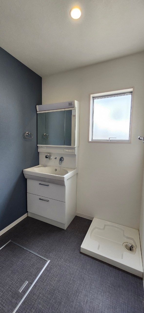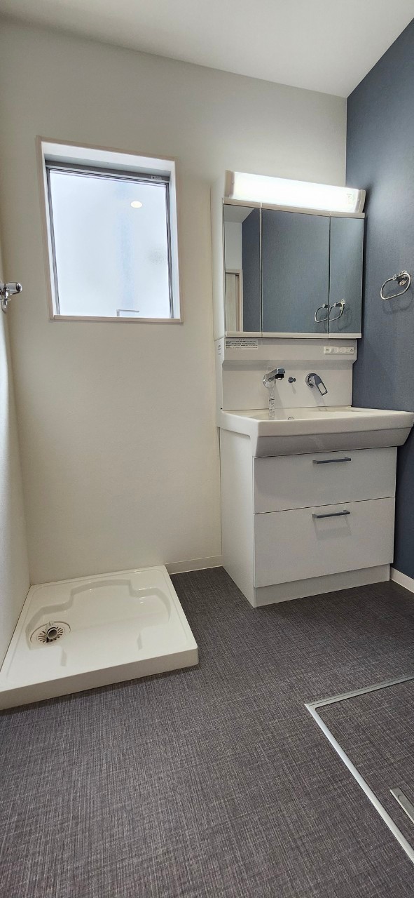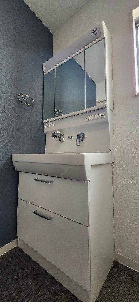洗面室はとっても広々、床下収納付!洗面台は最新の3面鏡(鏡の裏が収納)壁付シャワー水詮です・・・